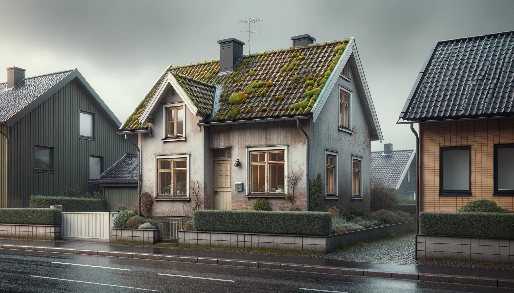 Tydlig algväxt på nordfasad. Mossa på tak synlig från gatan. Rekommendation: fasad- och taktvätt.